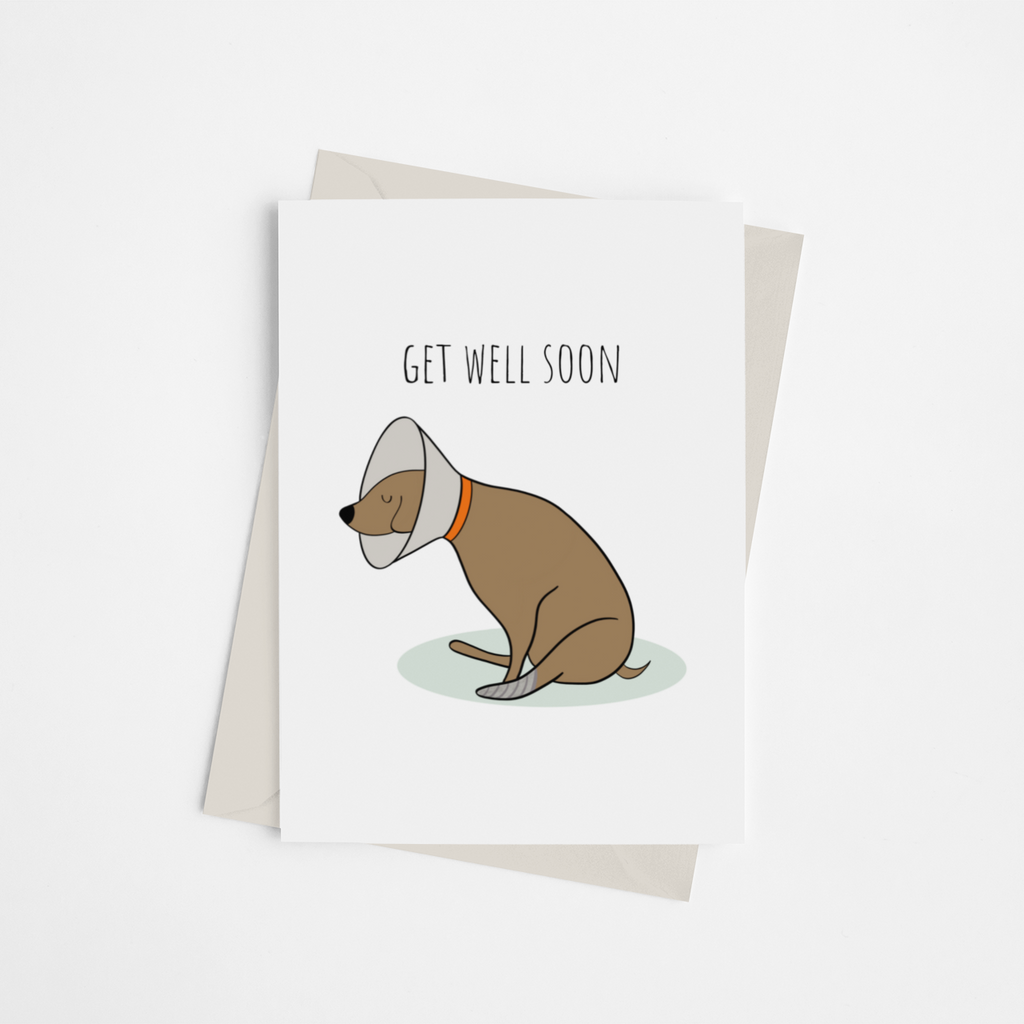 Do you have a friend that's not feeling well? Brighten their day with a "Get Well Soon" card featuring a poor dog in a cone.