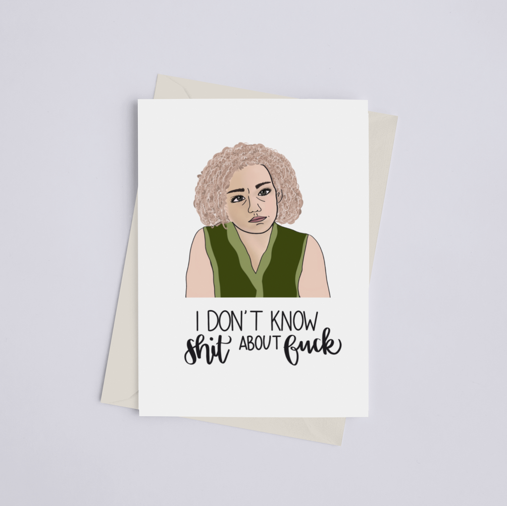 Featuring the fearless Ruth Langmore from Ozark, "I don't know shit about fuck." This card is perfect for fellow Ozark fans, and specifically, Ruth Langmore lovers. Ruth Langmore is a god damn badass, am I right?!